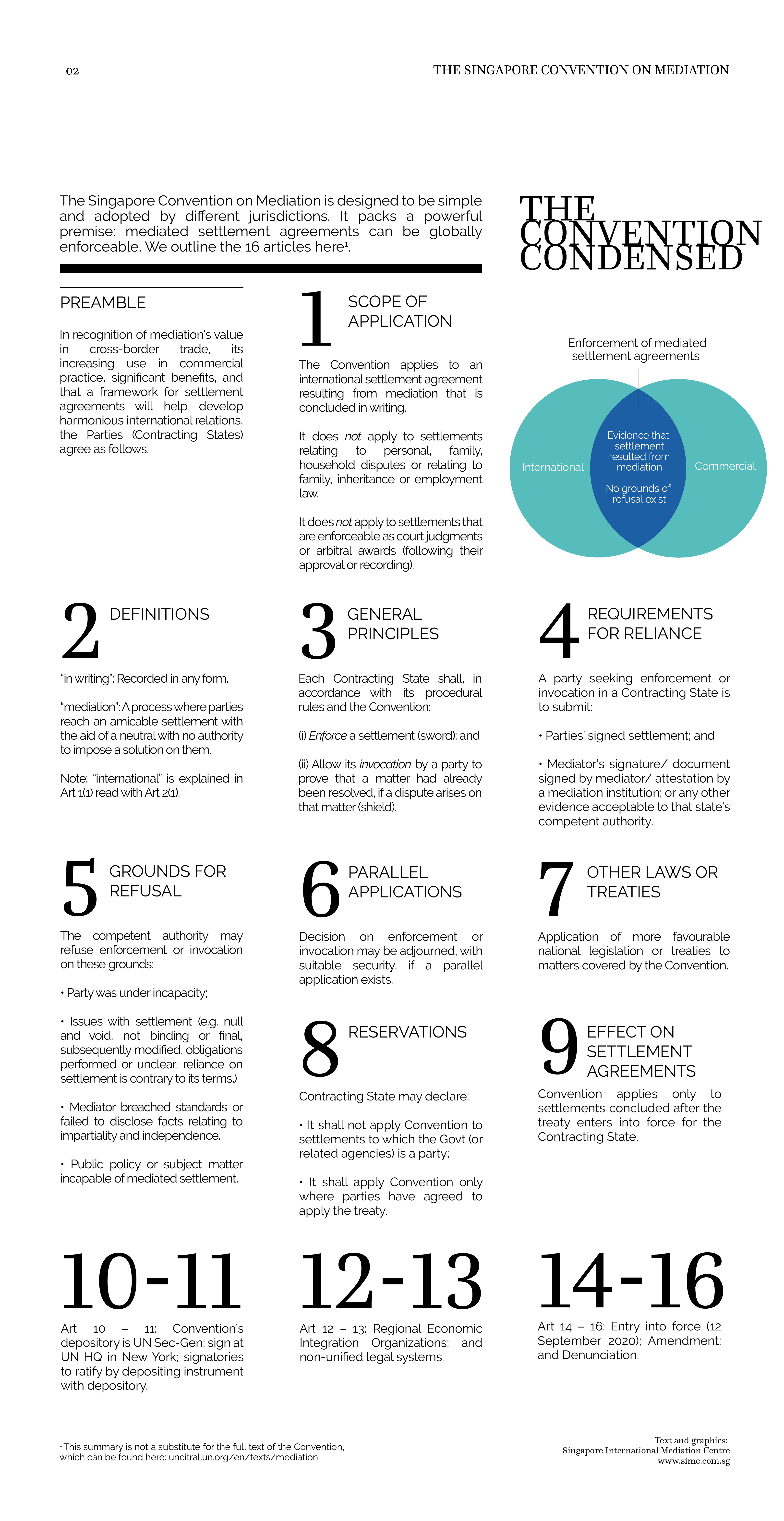 As international trade treaties go, the Singapore Convention on Mediation is relatively short. It was designed to be simple and easily applicable to different jurisdictions – no matter their legal traditions. Despite its brevity, the Convention packs a powerful punch in allowing mediated settlement agreements to be globally enforceable. In the second instalment of this series, we illustrate the Convention here in crisp, concise form.